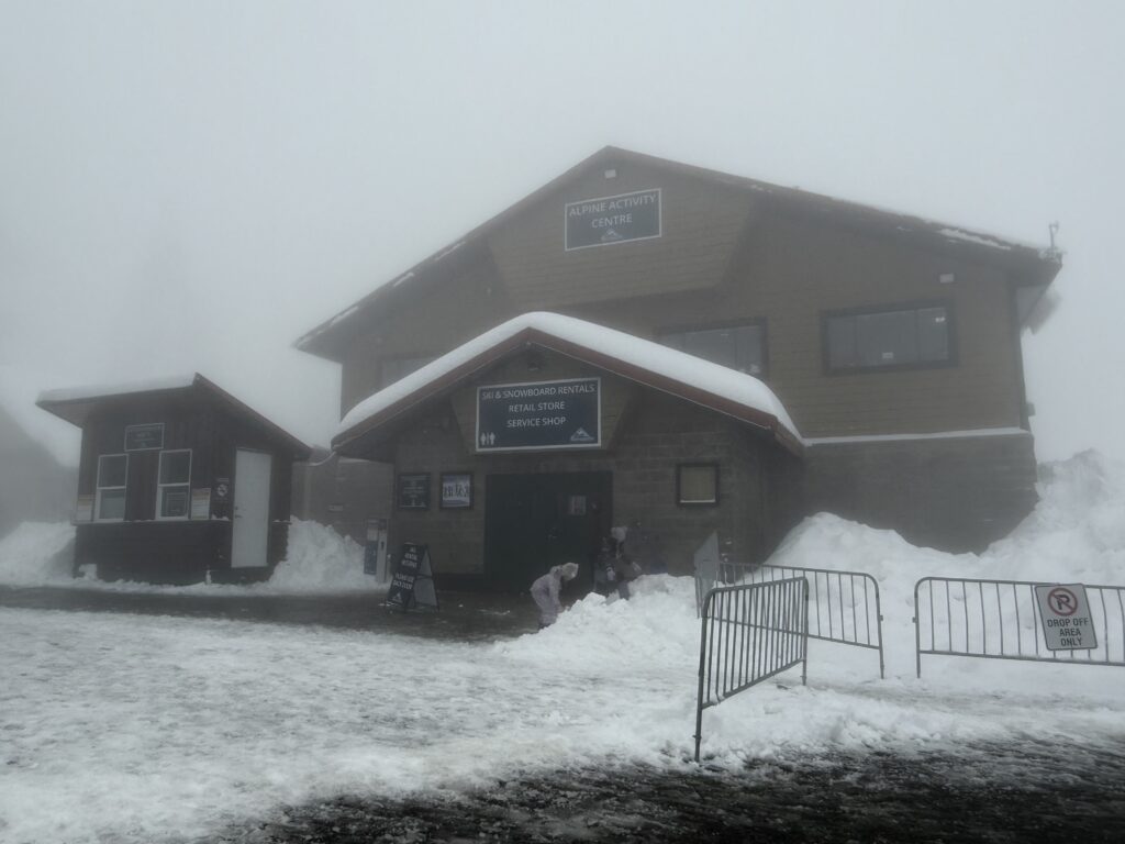 當天雪山上的能見度頗差(拍出來的照片效果都不太好,所以沒有很多相片可以給大家看),但所幸的是雪況還不錯,天氣夠冷但沒有風,而且前一晚還下了場雪,雪比較鬆。泊車後我們立刻就去客戶服務中心(在停車場旁邊)報到領取雪票,緊接著就去租滑雪裝備,但因種種原因最後遲到了半小時才趕上課堂(事情的因由請見「注意事項」段落,這裡就不重覆)。