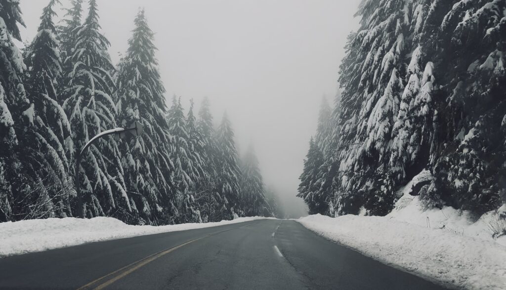 由於前往西摩山滑雪場的路有機會結冰,所以冬季時經過 Mt Seymour Road 的車輛都必需配備冬季胎(Mountain/snowflake tires 或四季胎 All-season Mud and Snow (M+S) tires)。我們上課當天霧很大,越往山上去霧就越嚴重,視野也越差,卻使沿途的景色變得更夢幻,一排排銀裝素裹的衫樹消失在濃霧中,猶如置身於仙境般。